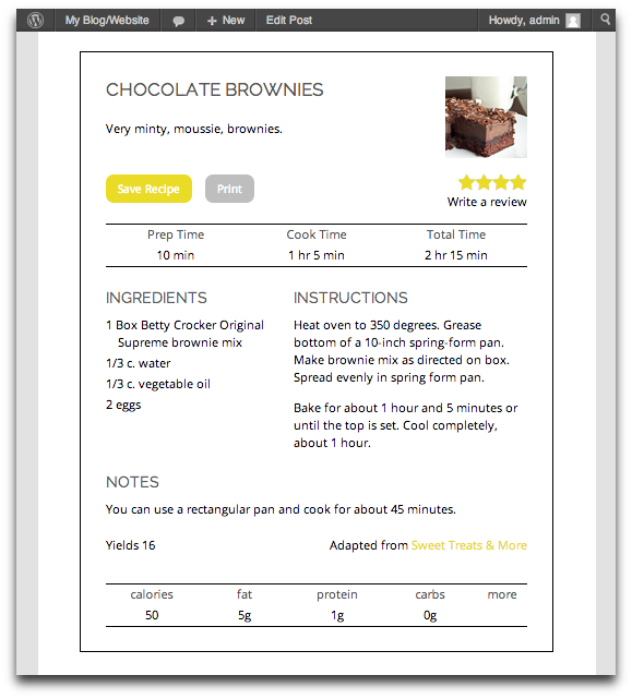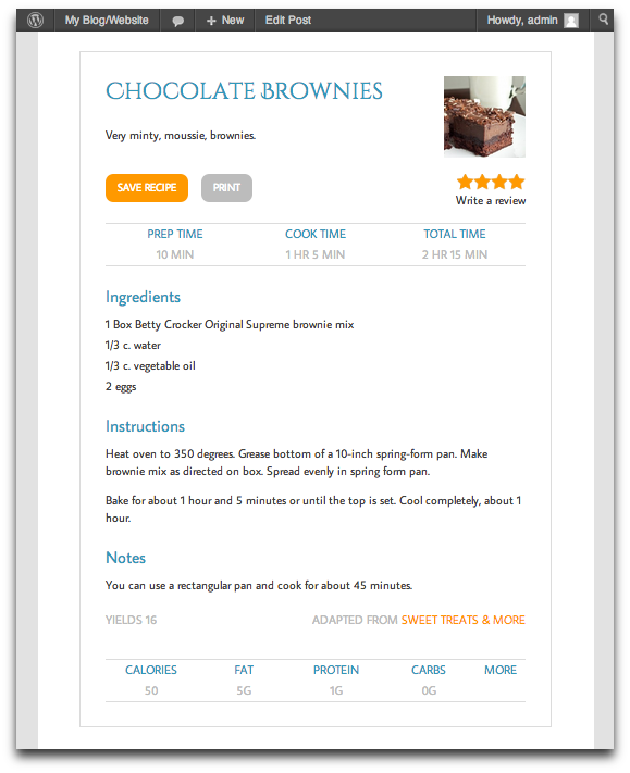 Ovaj plugin omogućuje čitateljima printanje, spremanje i ocjenjivanje recepata. Možete birati između stotinu boja, fontova i položaja elemenata prilikom izbora layouta (izgleda stranice s receptom). Svi su recepti optimizirani za tražilice (Google recipe search). Funkcije za unos podataka o receptu se integriraju s WordPress editorom. Recepti se mogu dodavati u članke pomoću shortcode-a.